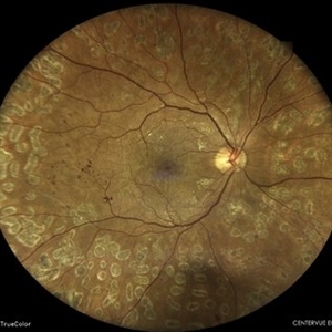 Color fundus photograph of a 42 year old male with multifocal choroiditis.