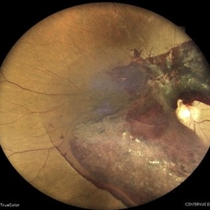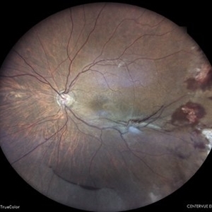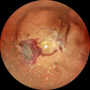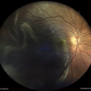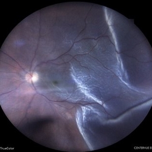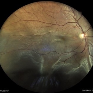 Color fundus photograph of a 30 year old female with a giant retinal tear.