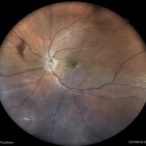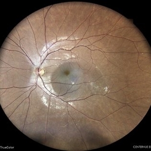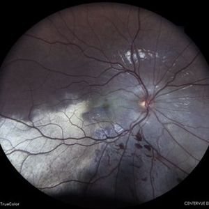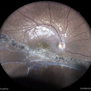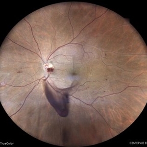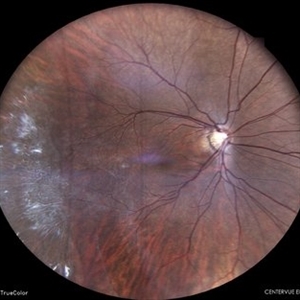 Color fundus photograph of a 36 year old female with spontaneously settled retinal detachment.