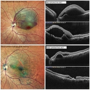 A 60 YEAR OLD FEMALE PRESENTED WITH COUNTING FINGERS VISION FROM A SUB-RETINAL HEMORRHAGE AT THE MACULA. OCT SHOWS VARIABLE SUB -RETINAL FLUID. PARS PLANA VITRECTOMY WITH DRAINAGE OF THE SUB-RETINAL BLOOD WAS PERFORMED. POST-OPERATIVE OCT SHOWS NO SUB-RETINAL FLUID WITH VARIABLE OUTER RETINAL CYSTIC CHANGES AND VISUAL ACUITY IMPROVING TO 20/120.