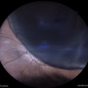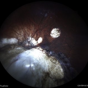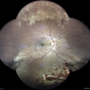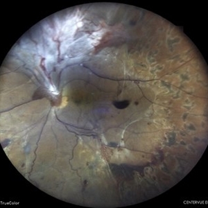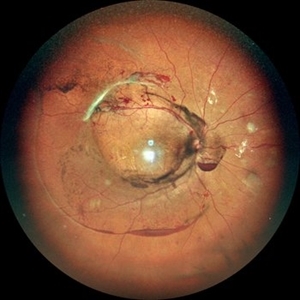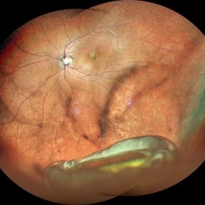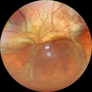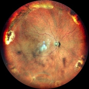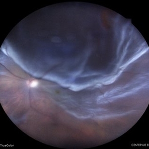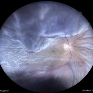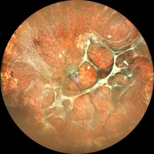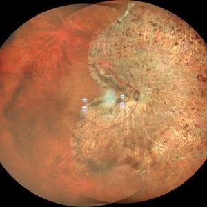 Fundus photograph of a 13 year-old female with giant retinal tear and retinal detachment in both eyes.