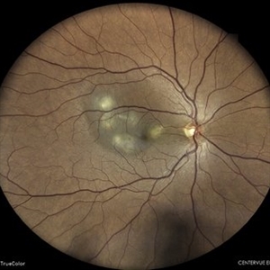 Color fundus photograph of a 40 year old male with TB choroiditis.