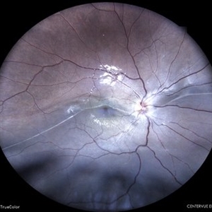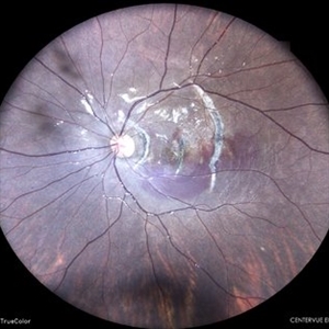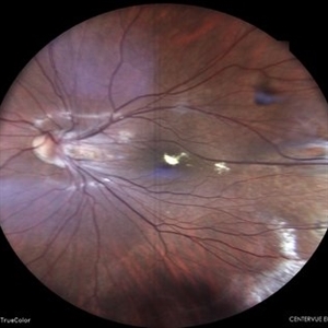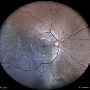 Color fundus photograph of a 10 year old male with old retinal detachment with subretinal band.