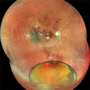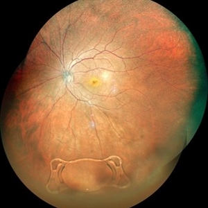 Wide-Field Fundus Photograph of a 66-year-old female patient with a dropped IOL and Capsule.