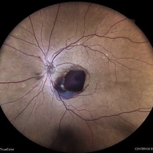 Color fundus photograph of a 2 year old male with both eyes retinoschisis.