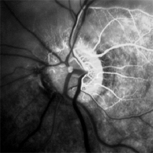 Acute branch retinal artery occlusion with a calcium embolus at the disc which is hyperfluorescent in FA.