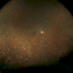 15-year-old boy with RD from a temporal giant retinal tear after blunt trauma. An encircling band was placed and shave vitrectomy was done. This photo was taken after silicone oil had been removed. There is a haze in the middle of the image due to a cataract.