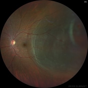 Fundus picture of left eye of 32-year-old female with rhegmatogemous retinal detachment with small break between 2 -3 'o' clock and subretinal fluid just encroaching the macula .