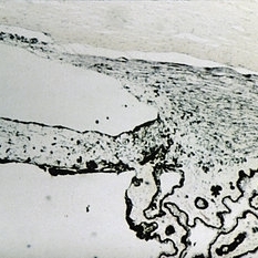 Epithelial downgrowth. The epithelium has grown onto the posterior surface of the iris.