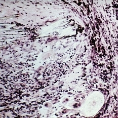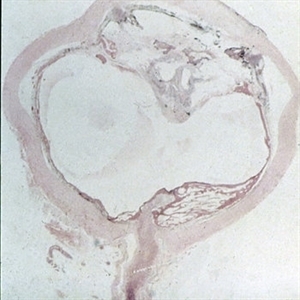Phacoanaphylaxis. The lens (upper left) is surrounded by an intense granulomatous inflammatory reaction. Note the ruptured lens capsule which is thrown into folds.
