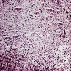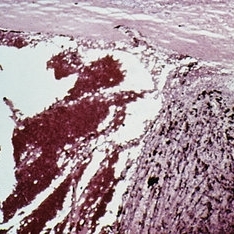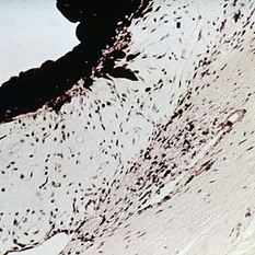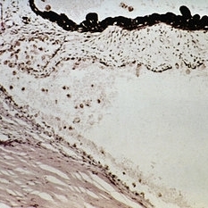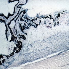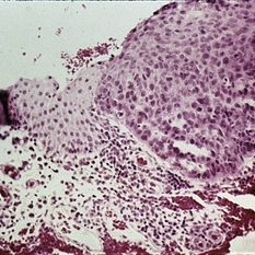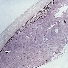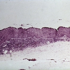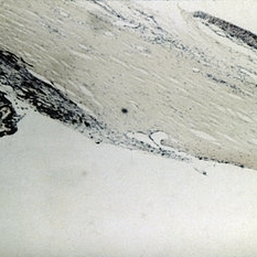 Carcinoma-in-situ. There is an abrupt change from normal conjunctiva (left) to carcinoma-in-situ.