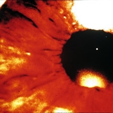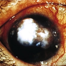 Keloid of the cornea. The entire cornea has been replaced by thickened, dense scar tissue.