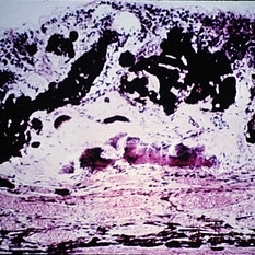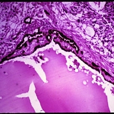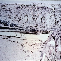 Internal erosion of silicone plate and silastic band. An intense acute and chronic inflammatory reaction surrounds the eroded silastic band (lower right). It was believed that the erosion of the encircling band and plate occurred as a result of its having been tied too tightly.