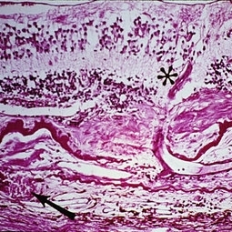 Senile macular degeneration with disciform scar. A retinal arteriole (asterisk) extends into the subretinal component of the scar, through a break in the thickened and detached inner layer of Bruch's membrane, and then into the vascularized intra-Bruch's-membrane component of the scar. Study of serial sections disclosed this retinal vessel to anastomose with the choroidal vessel (arrow) which extends through a branch in Bruch's membrane.