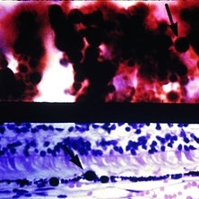 Cholesterol emboli to retina and choroid. There is a large microinfarction of the nerve fiber layer (arrows). A cholesterol embolus is lodged in a retinal arteriole (upper right) proximal to the microinfarction. Cholesterol emboli were also found in the choroid, and in one (lower right) erythrocytes (arrow) could be seen in the periphery as they were presumably going around the embolus.