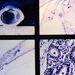 Retinal dysplasia in the Petau syndrome. The microphthalmic eye has a dysplasic retina behind the lens, extending as a strand (arrow) to attach to the retina posteriorly (views on left). The rosettes (asterisks) have a well-developed external limiting membrane (arrow) and photoreceptor outer and inner segments (lower right). There is also a hyperplasic primary vitreous (upper right) with a small nodule of cartilage (arrow).