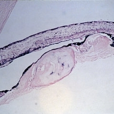 Anterior subcapsular cataract. Plaque of tissue beneath the anterior capsule replacing epithelium (PAS x21).