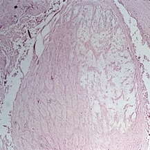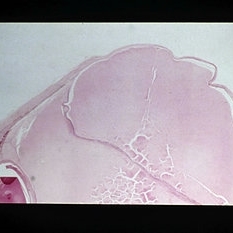 Sequelae. Cavernous degeneration of the optic nerve (Schnabel's cavernous atrophy) shows cystic spaces which appear clear in hematoxylin and eosin stained sections (H&E x21).