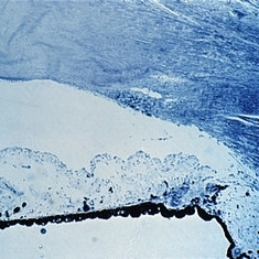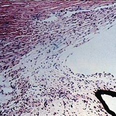 Sequelae. Stains for acid mucopolysaccharides (left) show spaces to contain AMP. The AMP disappears if the tissue on the slide is first digested with hyaluronidase (right), showing that the material is hyaluronidase-sensitive AMP, presumably hyaluronic acid (left view, AMPxl6; right view, hyaluronidase-AMPx16).