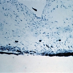 Pigmentary glaucoma. Necrosis of the iris pigment epithelium, macrophages filled with pigment in the iris stroma, and atrophy and hyperplasia of the iris dilator muscle are present (H&E x101).