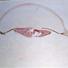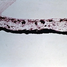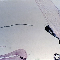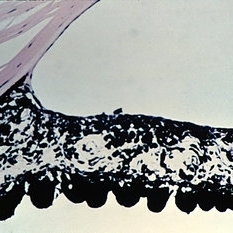 A necrotic iris is shown, with loss of stroma as well as dilator and sphincter muscles (H&E x21).