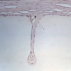 Congenital glaucoma. The ruptured end of a Descemet's membrane has healed over so that the scroll-like extension of the membrane hanging into the anterior chamber is covered completely by endothelium (H&E xlOl).