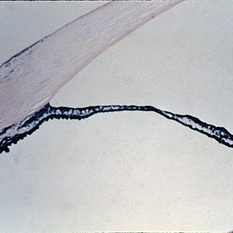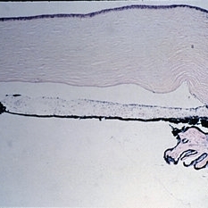 Congenital glaucoma. Anterior chamber angle from a 2-year-old child with congenital glaucoma is cut tangentially and resembles the configuration seen normally in a fetus (H&E xlOl).