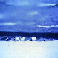 Sequelae. Basal layer of the corneal epithelium is pale and swollen by edema fluid. Further accumulation of edema fluid will lift the epithelium off of Bowman's membrane, resulting in bullous keratopathy (see Slide 12-16) (Masson's tri chromex250).