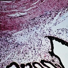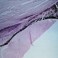 Sequelae. Increased intraocular pressure has resulted in stretching and thinning of the sclera in the equatorial region, resulting in an equatorial staphyloma (H&E x3).
