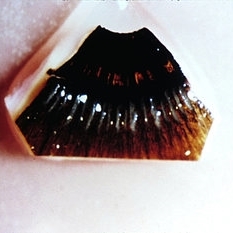 Pigmentary glaucoma. Macroscopic appearance of the back of the iris. Note that the main loss of iris pigment epithelium occurs where the middle and peripheral thirds of the iris meet.