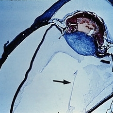 Persistence and hyperplasia of the primary vitreous (PHPV). The dense fibrovascular tissue molds the posterior surface of the lens and has drawn the ciliary processes and peripheral retina toward the center of the mass. A section of the hyaloid artery is present in the vitreous cavity (arrow). (A.F.l.P. No. 744398)