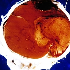 Extensive vitreous and intraocular hemorrhage from a necrotic malignant melanoma. The eye was enucleated with the diagnosis of absolute glaucoma and possible old central retinal vein occlusion. (E.P. No. 31366)