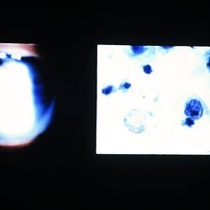 Ocular reticulum-cell sarcoma. Appearance of vitreous cells and debris (left) in a 61-year-old man with a 2-year history of recalcitrant uveitis. Pars plana vitrectomy specimen was prepared, using a millipore filter and staining by a modified Papanicolaou technique. Tumor cells with nuclear cytoplasmic disproportion and finger like nuclear extensions are characteristic of reticulum-cell sarcoma (right). (E.P. No. 38606)