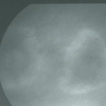 Late-phase (5 minutes) FA frame of the left eye of a 73-year-old white female with regional choriocapillaris atrophy showing light staining from intact choriocapillaris around the margins of the peripapillary and macular areas of RPE and choriocapillaris atrophy; VA= 20/100.