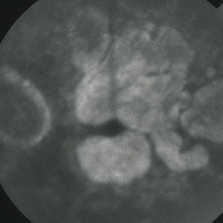 Late-phase fluorescein angiogram image of the right eye of a 64-year-old white male with central areolar choriocapillaris atrophy showing late leakage from intact choriocapillaris around the perimeter of the disc and macular areas of choriocapillaris atrophy; VA= 20/50