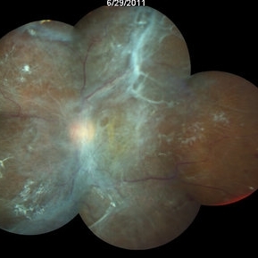 Fundus photo shows classic 'tomato-ketchup' red appearance of diffuse hemangioma. Due to chronic SRF , there is subretinal fibrosis.