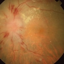 Left eye of a 78-year-old Vietnamese male with malignant hypertension demonstrating ischemic optic disc edema, marked arteriolar narrowing, intraretinal hemorrhages, and lipid exudation; V.A.= counting fingers at 1 foot.