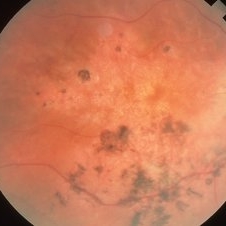 White male with a pigmentary retinopathy OD secondary to long-term treatment with Mellaril for psychosis.