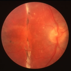 Temporal periphery of a 15-year-old white male with juvenile retinoschisis OD.