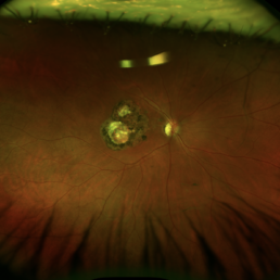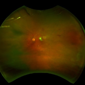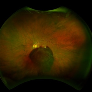 Optos image of a patient with extensive choriorretinal scar due to toxoplasmosis infection.