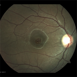 Fundus photography of an 14 years old man with Full Thickness Macular Hole after direct exposure of the blue laser to his eye