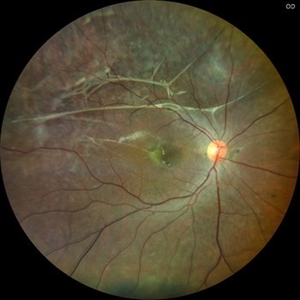 Fundus image of a 16-year-old male patient with a history of trauma 1 year back leading to diminution of vision followed by spontaneous incomplete visual function regain after some time without any history of any surgical intervention.