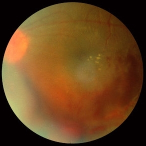 Fundus photo of the left eye reveal signs of vasculitis with exudate and a vitreous hemorrhage.
