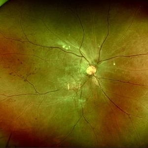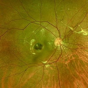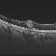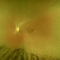 Fundus photo of left eye of 34 year male patient with high hypermetropia(+14). BCVA 20/20 in right eye and 20/60 in left eye. Anterior segment was normal. There is loss of foveal pit with omega shaped elevation of inner retinal layers.