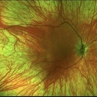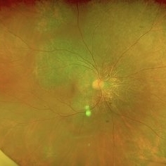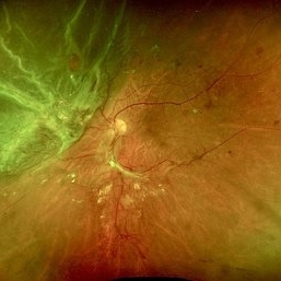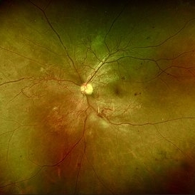 Ultra wide field Fundus image of the left eye of a 72 yr male with history of progressive loss of vision and loos of field of vision more in left eye.