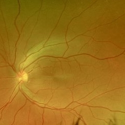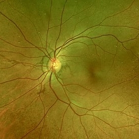 Fundus photo of Right eye of 34 year male patient with high hypermetropia(+14). BCVA 20/20 in right eye and 20/60 in left eye. Anterior segment was normal. There is loss of foveal pit with omega shaped elevation of inner retinal layers.
