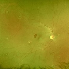 This Fundus photograph in red spectrum is of a 16 year girl with bilateral choroidal osteoma with choroidal neovascular membrane