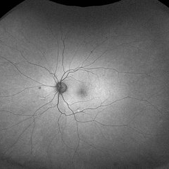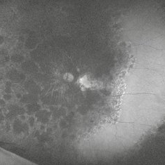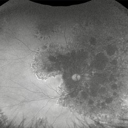 Autofluorescence image of right eye of a 72 yr male with history of progressive loss of vision and loss of field of vision more in left eye.It shows an area of normal AF, zone of hypoautofluorescence near the disc and a border of stippled hyper fluorescence.