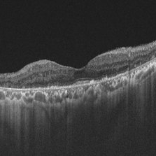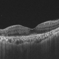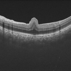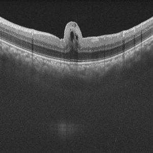 Swept source OCT image of Right eye of 34 year male patient with high hypermetropia(+14). BCVA 20/20 in right eye and 20/60 in left eye. Anterior segment was normal. There is loss of foveal pit with omega shaped elevation of inner retinal layers.