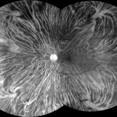 Red LED (585 - 640nm) confocal scanning laser ophthalmoscopy of a 37-year-old male with myopia highlighting choroidal vessels and vortex veins.
